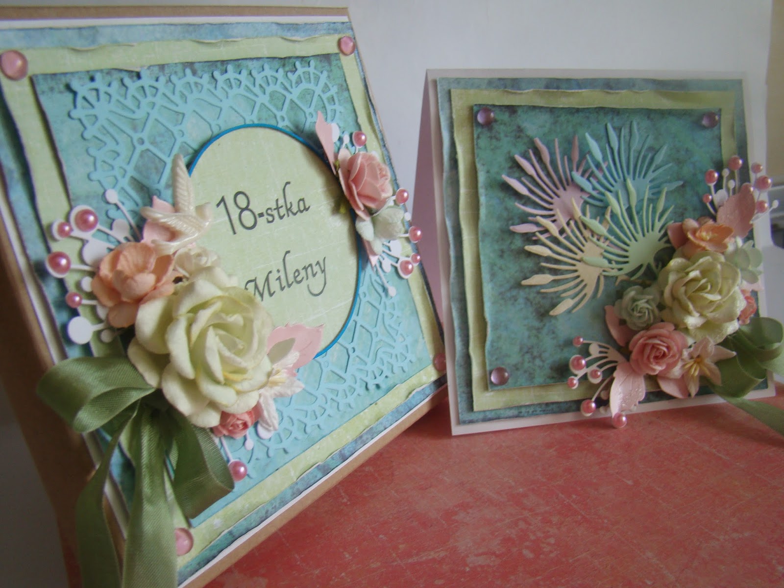 Wieczorem zeszła z mojego biurka kolorowa i optymistyczna kartka ,a właściwie komplet na 18-ste urodziny... Miała być radosna i soczyście ubarwiona... I tak sobie zaszalałam z papierami i dodatkami w różnych odcieniach turkusu,rózu,zieleni ,mięty i brzoskwini;). Właścicielka zachwycona i oto chodziło;) Zapraszam do poniższej galerii:)